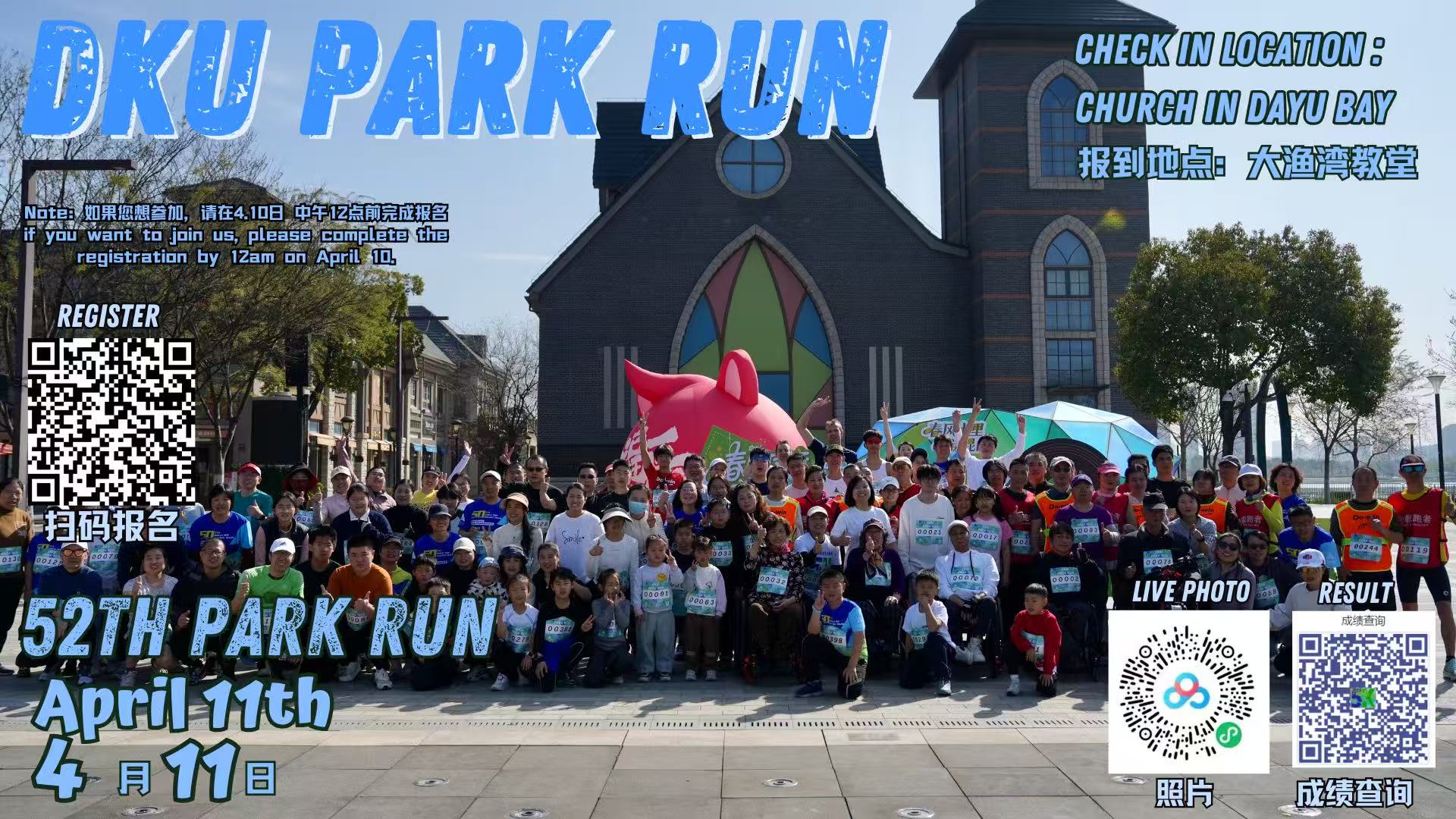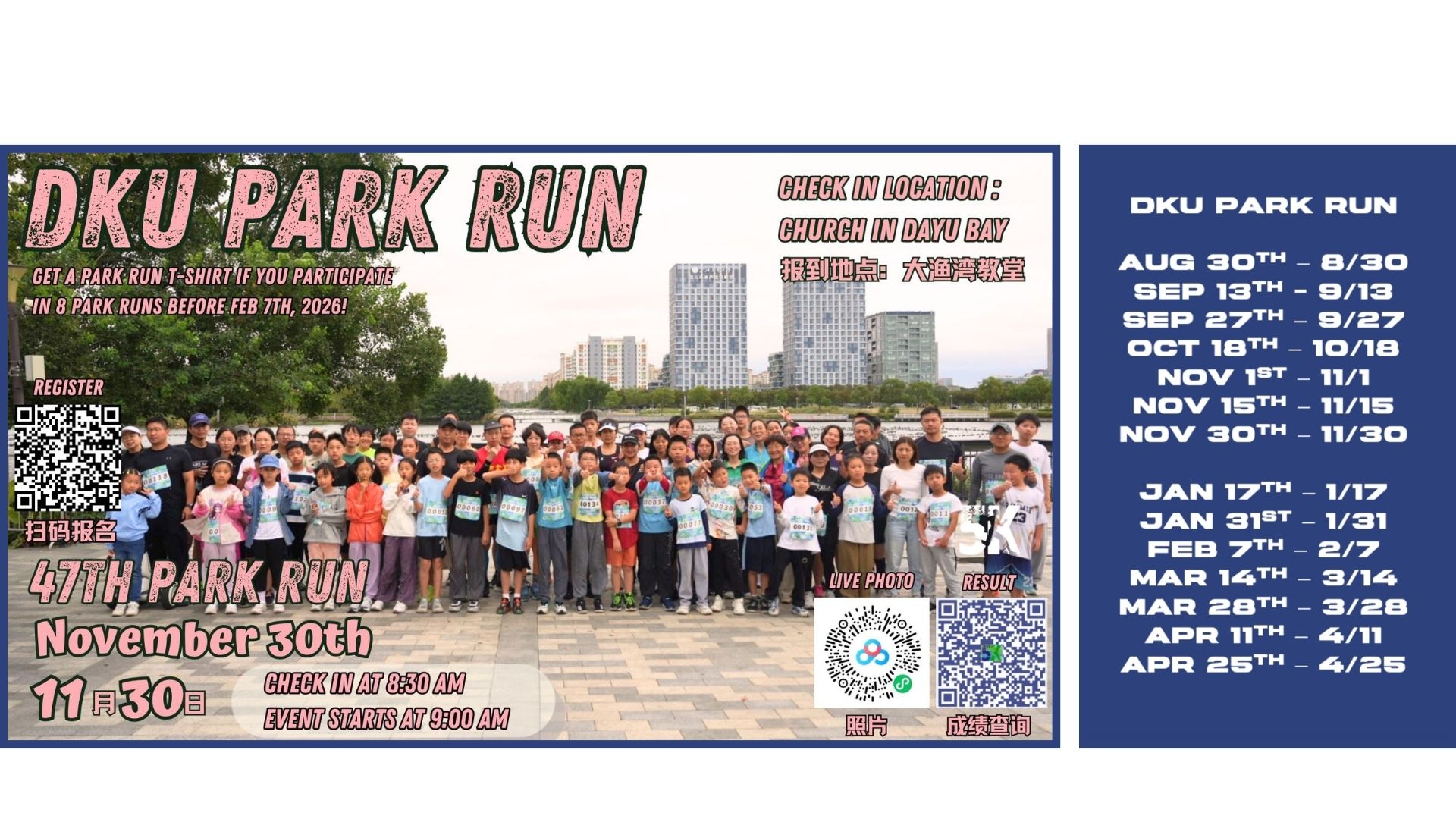 DKU Park Run is hosted in Dayu Bay Park, as participants will run two loops around its perimeter, totalling approximately 5KMs; Check-In is held in Dayu Bay Village, which is along the course, in front of the Dayu Bay Chapel, starting at 8:30 AM.