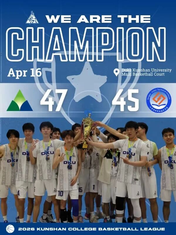 In the April 16 final, DKU Men’s Basketball team rallied to defeat Jiangsu Union Technical Institute (Kunshan Campus) 47–45, earning their first victory over this formidable opponent in four years.
