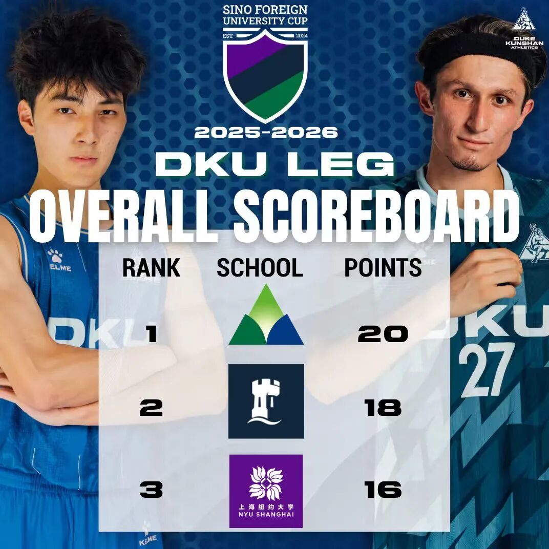 After the DKU leg of the Sino-Foreign University Cup, Duke Kunshan leads the scoreboard with 20 points, followed by the University of Nottingham Ningbo (18) and NYU Shanghai (16).